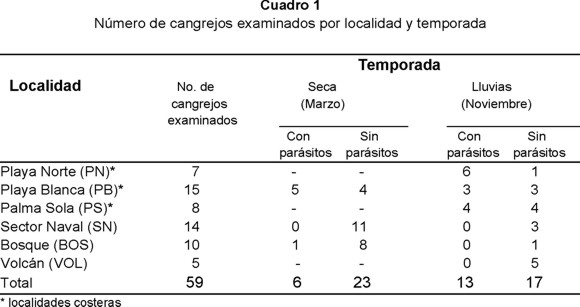 La prevalencia de cangrejos parasitados en la temporada lluviosa fue el doble que en la temporada seca (43.3% vs. 20.7%; Cuadro 1). Sin embargo, no se encontraron diferencias significativas en la abundancia de cistacantos por cangrejo entre ambas temporadas (U-Mann Whitney p>0.05). La prevalencia, abundancia e intensidad de infección fueron significativamente mayores (U-Mann Whitney p<0.01) en las localidades costeras (Cuadro 2). Esto puede deberse a diferencias en: a) el hábitat del hospedero definitivo, la garza nocturna se distribuye principalmente en las zonas bajas de la isla (Rodríguez-Estrella 1994. In: La Isla Socorro, Reserva de la Biósfera Arch. Rev., Méx. Pp. 199-224); b) la temperatura ambiental, templada en las zonas costeras que pudiera favorecer el desarrollo de las etapas larvarias ó c) la humedad relativa, mayor en las zonas costeras (Coria 1994. Op. Cit. Pp. 55-62) que pudiera prolongar la viabilidad de los huevos, una vez defecados por el hospedero definitivo.