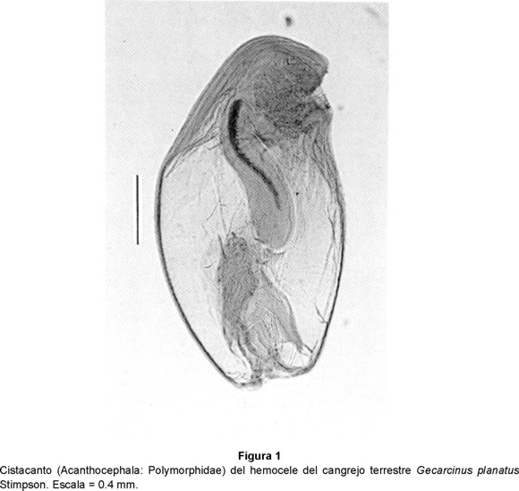 Se encontraron 19 cangrejos parasitados con cistacantos (32.2%), localizados en el hemocele, a la altura del intestino posterior. Los cistacantos (Fig. 1) probablemente corresponden al género Arhythmorhynchus Lûhe, 1911 (Familia Polymorphidae Meyer 1931). Se extrajeron 138 cistacantos de los 19 cangrejos infectados, con un máximo de 29 por cangrejo.