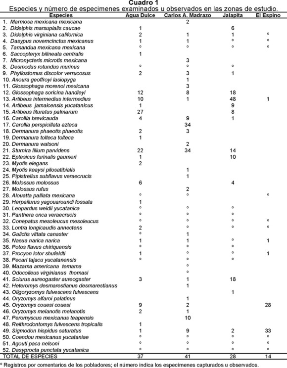 El área con la mayor riqueza de especies fue Carlos A. Madrazo (n= 41), que se caracteriza por tener la vegetación mejor conservada, seguida de Agua Dulce (n= 37), que presenta huertos y zonas cercanas con vegetación natural. Jalapita (n= 28) y El Espino (n= 10) son los sitios con menor diversidad de mamíferos. En estas zonas los pobladores se dedican principalmente a la agricultura y la ganadería. Como consecuencia, la vegetación original ha sido sustituída por pastizales y cultivos de considerable extensión y por algunos huertos familiares. Aunado a ésto, los insecticidas, así como los desechos urbanos e industriales que se vierten en los ríos cercanos a Agua Dulce, Jalapita y El Espino, provocan no sólo que la calidad del agua disminuya, sino que también favorece la desaparición de la fauna, como se ha observado en otros ríos (Mason & MacDonald 1986, Gallo 1989).