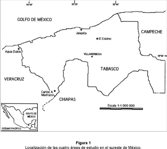 Se encuentra en el sureste de la República Mexicana, comprende parte de: 1) el municipio de Agua Dulce, Veracruz, 18° 09.658'N, 94° 09.134'W; 2) el ejido Carlos A. Madrazo del municipio de Huimanguillo, Tabasco, 17° 23.787'N, 93° 39.729'W; 3) el ejido Jalapita del municipio de Centla, Tabasco, 18° 24.987'N, 93° 00.024'W, y 4) el ejido El Espino del municipio de Villahermosa-Centro, Tabasco, 18° 14.677'N, 92° 50.083'W (Fig. 1). En Agua Dulce, Jalapita y El Espino el clima es cálido-húmedo con lluvias en verano, mientras que en Carlos A. Madrazo el clima es cálido-húmedo con lluvias todo el año. En las cuatro áreas de estudio la temperatura promedio oscila entre 20 y 30 °C. La precipitación pluvial promedio varía de 60 mm en el mes más seco (abril) hasta 2,300 mm en septiembre, que es el mes más húmedo (García 1989).