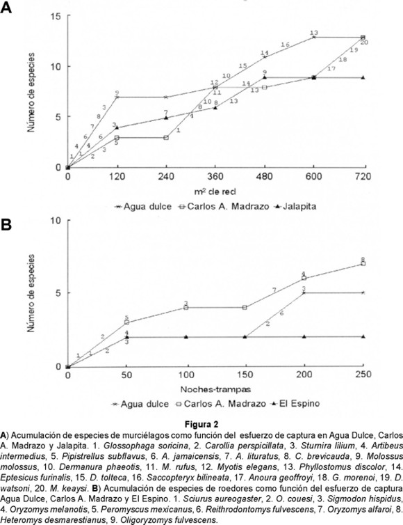 En el caso de los roedores, el número máximo de especies para Carlos A. Madrazo (n= 7) y Agua Dulce (n= 5) se registró a las 250 noches-trampa; mientras que para El Espino las únicas dos especies capturadas se registraron a las 50 noches-trampa. Oryzomys couesi y Sigmodon hispidus fueron comunes en las tres áreas de estudio. Sciurus aureogaster y Oryzomys melanotis se encontraron en Agua Dulce y Carlos A. Madrazo, mientras que Heteromys desmarestianus, Oryzomys alfaroi y Peromyscus mexicanus sólo se capturaron en Carlos A. Madrazo y Reithrodontomys fulvescens fue exclusivo de Agua Dulce (Fig. 2B).