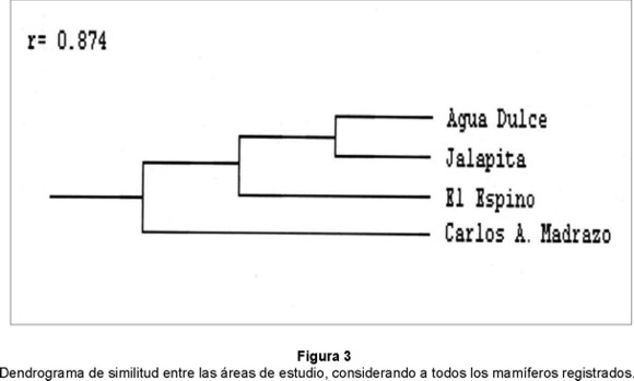 El dendograma que resultó al incluir y comparar a todos los mamíferos en las cuatro áreas de estudio (Fig. 3) muestra que Agua Dulce y Jalapita son las áreas más similares (d= 6.403), seguidas de El Espino (d= 8.689) y Carlos A. Madrazo (d= 9.798; r= 0.874). Un agrupamiento similar se obtuvo cuando se consideró a los murciélagos y los roedores de manera independiente.