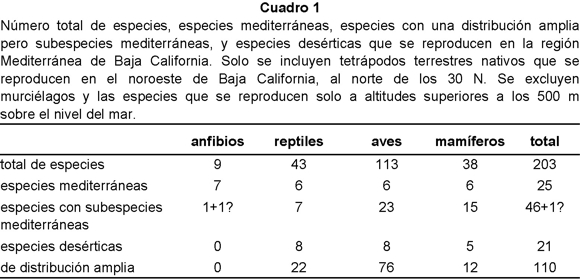 La fauna de la región "Mediterránea" es poco determinada en cuanto al origen de las especies que la componen (Cuadro 1) y no se puede señalar que en Baja California hay, al nivel de especies, una fauna mediterránea típica, a excepción de los anfibios, de los cuales 7 de las 9 especies son mediterráneas. La mayoría de las especies de tetrápodos que se reproduce en esta región tiene una distribución que excede los límites de esta comunidad. También, hay casi tantas especies desérticas como mediterráneas en el noroeste de Baja California.