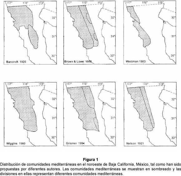 Con base en la distribución de los taxa mediterráneos, el Arroyo del Rosario marca el límite sur del Mediterráneo en Baja California (aproximadamente a los 30, Fig. 2), ya que el 38% de todas las especies mediterráneas y el 38% de todas las subespecies que tienen un límite distribucional en el noroeste de Baja California lo tienen en esta área. Sólo dos especies mediterráneas extienden su distribución hacía el sur de este límite, pero con subespecies diferente mas allá de este límite. Muchas de las especies desérticas que entran al mediterráneo por el sur, también tienen diferentes subespecies al norte de este límite. Además de la distribución continua del mediterráneo, se deben de incluir en la definición algunos oasis y comunidades relicto de chaparral (v.gr. Grismer & McGuire 1993, Grismer & Mellink 1994). Este límite coincide burdamente con la distribución de la vegetación mediterránea (Delgadillo 1992). A pesar de un límite tan definido, las especies mediterráneas empiezan a desaparecer desde el Arroyo de San Telmo, mucho más al norte.