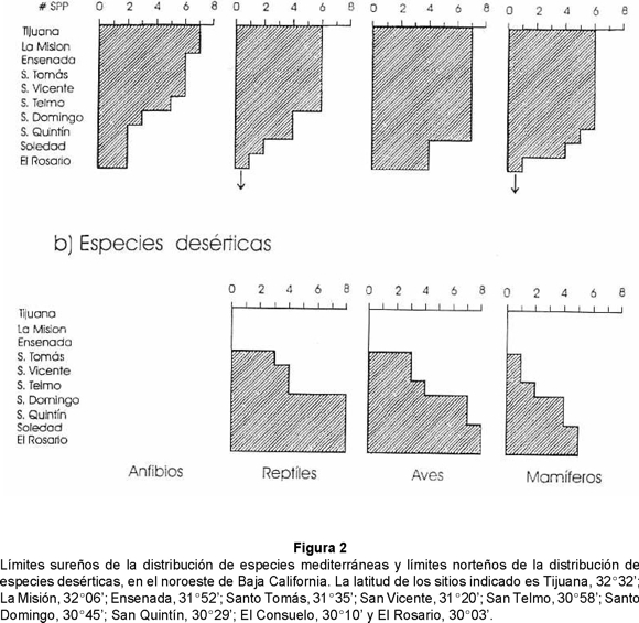 Por otra parte, 6 especies desérticas incursionan desde el sur hasta Ensenada, y 17 llegan cuando menos hasta el Arroyo de San Telmo (Fig. 2). De esta forma, aunque los límites de la región mediterránea en Baja California están dados por el Arroyo del Rosario, desde alrededor de Ensenada empieza a haber influencia de especies desérticas y desde Arroyo de San Telmo hay un marcado empobrecimiento de especies mediterráneas. Hay muy poca presencia de especies mediterráneas de tetrápodos al sur del Arroyo del Rosario.