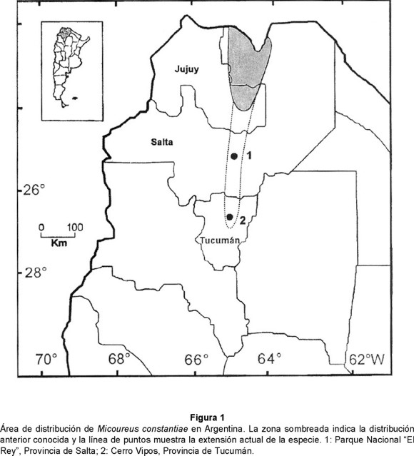 Recientemente, como parte de un estudio sobre la sistemática y distribución de los marsupiales de Argentina, se encontraron dos ejemplares (Cuadro 1) de Micoureus constantiae procedentes de dos localidades ubicadas fuera de la distribución conocida para la especie (Fig. 1). El primero de ellos corresponde a una hembra adulta, catalogado con el número 6117 en la Colección de Mamíferos del Instituto Argentino de Investigaciones de las Zonas Áridas (IADIZA), Mendoza, Argentina. El ejemplar fue colectado en el Parque Nacional "El Rey", Provincia de Salta (24º 42' S, 64º 38'W), aproximadamente 150 km al sur Calilegua (23º 46' S, 64º 47'W), la localidad más austral previamente conocida para la especie (Flores et al. 2000. op. cit.). Esta nueva localidad se ubica en un área protegida de la provincia fitogeográfica de las Yungas.