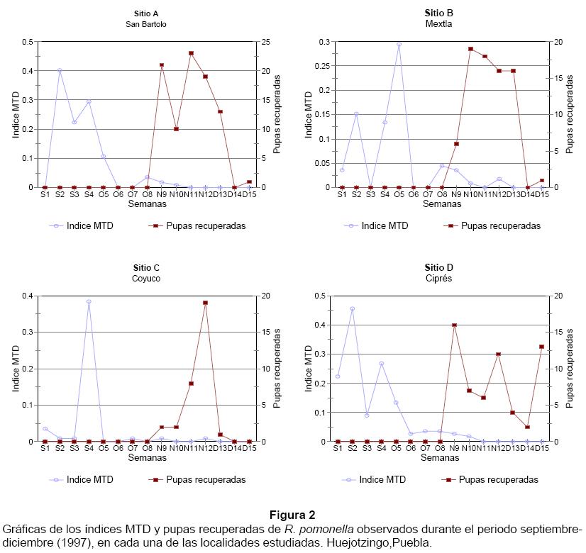 En términos de las medidas que deben implementarse para el control de la R. pomonella en la región de Huejotzingo, es necesario considerar que los adultos aparecen poco tiempo después de que se alcanzó la máxima precipitación pluvial en la región (julio), mientras que el decremento poblacional se acentúa cuando la temperatura media mensual y la precipitación pluvial inician su descenso (octubre). Basados en estos argumentos, y en el hecho de que las poblaciones de R. pomonella tienen una diapausa en el estado pupal, resulta innecesaria la aplicación de tratamientos desde la floración enfocados a disminuir el daño ocasionado por esta especie. Por ello se recomienda que la detección de adultos se inicie desde mediados del mes de agosto, cuando probablemente emergen los primeros individuos de la generación. Los resultados obtenidos sobre el incremento de la población de adultos, sugieren que la etapa más susceptible de infestación del tejocote en la región, ocurre en un periodo de aproximadamente seis semanas, la cual tiene sus inicios alrededor de la tercera o cuarta semana de agosto, y se extiende hasta finales de septiembre o primera semana de octubre.