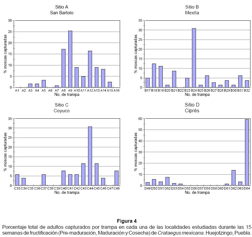El porcentaje de capturas registradas en cada trampa fue muy variable, puesto que en una misma localidad se presentaron trampas que no capturaron ningún individuo, en tanto que otras capturaron las mayores proporciones. En San Bartolo la trampa A9 registró el 25% de capturas; en Mextla, la trampa B24 registró el 30%; en Coyuco la trampa C44 poco más del 30%; y en Ciprés la trampa D64 registró casi el 60% de las capturas (Fig. 4). Con base en la captura de las trampas, se analizó la distribución espacial de los individuos en cada localidad, calculando el índice de dispersión. Estos resultados indicaron que existe una fuerte agregación en todos los sitios estudiados (Cuadro 1).