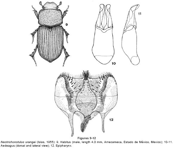 | 2' | Apical sutural angle of elytra rounded. Blackish; clypeal margin, anterior angles of pronotum and elytral apex reddish brown. Length 3.5-4.0 mm. Durango State ....................................................................................... N. inurbanus | ||||||