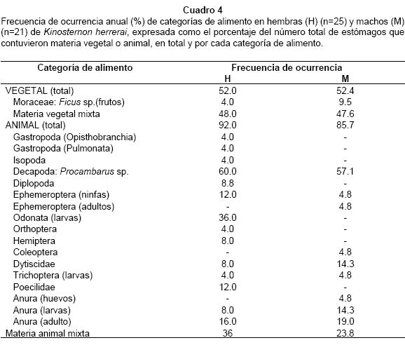 Los valores bajos de frecuencia numérica de las dos categorías de alimento vegetal en la dieta de K. herrerai sugieren que por lo general éstas son ingeridas accidentalmente, aunque en algunos casos se puede inferir que hubo ingestión intencional, como los frutos de Ficus, cuando al madurar y caer en los arroyos son un recurso alimentario accesible para las tortugas. Sin embargo, en el análisis de dietas de quelonios omnívoros no siempre es evidente si la materia vegetal es ingerida intencional o accidentalmente junto con las presas animales (Lindeman 1996, Rowe & Parsons 2000). La mayoría de las especies de Kinosternon son omnívoras y de hábitos alimentarios oportunistas (Mahmoud 1968, Hulse 1974, Berry et al. 1997). Algunas especies son más herbívoras, como K. oaxacae (Iverson 1986), pero otras son más carnívoras, como K. alamosae (Iverson 1989), K. creaseri (Lee 1996), K. chimalhuaca (Berry et al. 1997), K. dunii (Ernst & Barbour 1989), K. hirtipes (Ernst & Barbour 1989), K. flavescens (Punzo 1974, Iverson 1989), K. leucostomum (Villa 1973, Moll 1990) y K. sonoriense (Hulse 1974, Ligon & Stone 2003).