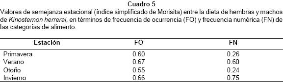 La semejanza de la dieta de hembras y machos calculada con el índice simplificado de Morisita aumentó en el verano y el invierno y disminuyó en la primavera y el otoño (Cuadro 5). En comparación con los machos, las hembras consumieron 50% más categorías de presa en la primavera y 69% más en el otoño. En contraste, los machos consumieron en el verano sólo 20% más categorías de presa que las hembras, y en el invierno las hembras consumieron sólo 12.5% más categorías de presa que lo machos. Cuatro categorías de alimento fueron consumidas por machos y hembras de K. herrerai durante todas o la mayoría de las estaciones del año: el decápodo Procambarus sp. y la materia vegetal mixta aparecieron en los contenidos estomacales de los dos sexos en las 4 estaciones, mientras que los anuros adultos y la materia animal mixta aparecieron en 3 estaciones.