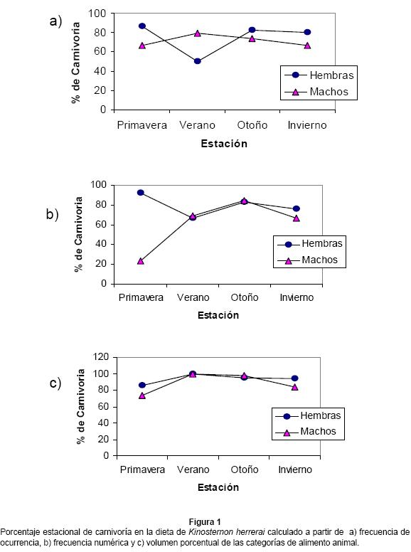 Las tortugas de la población estudiada fueron omnívoras con un grado alto de carnivoría. En términos de frecuencia de ocurrencia anual, las categorías de alimento animal fueron ingeridas en mayor proporción que las categorías de alimento vegetal por individuos de los dos sexos (Cuadro 4), y la diferencia fue significativa para las hembras (92% vs. 52%, Kolmogorov-Smirnov, D=0.42, P=0.03) pero no para los machos (85.7% vs. 52.4%, D=0.35, P=0.18). Esta tendencia a la carnivoría se expresó también en el porcentaje anual de estómagos que contuvieron alimento animal y/o vegetal, el cual fue mayor en los dos sexos (animal+vegetal: hembras 48%, machos 42.5%; animal: hembras 44%, machos 42.9%) en comparación con el porcentaje de estómagos que contuvieron exclusivamente categorías de alimento vegetal (hembras 4%, machos 9.5%). Tomando como medida de la carnivoría los porcentajes de la frecuencia de ocurrencia, de frecuencia numérica y de volumen de las categorías de alimento animal consumidas por los dos sexos de manera estacional, es aparente una tendencia a consumir porcentajes altos de materia animal a lo largo del año, con excepción del valor de frecuencia de ocurrencia de los machos en la primavera (Fig. 1).