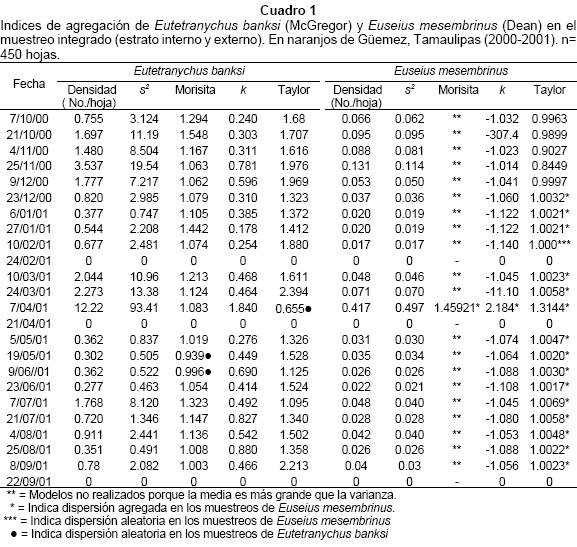 La población de Euseius mesembrinus, tuvo un patrón de distribución uniforme, al igual que lo registran Hernández et al. (1992a), quienes atribuyen este hecho al comportamiento competitivo de la especie. Sevachieran y Stern (1972) mencionan la respuesta a la depredación como uno de seis factores que condicionan la disposición espacial de los individuos de una población de ácaros depredadores. Taylor (1984) menciona que en las especies que se reproducen muy rápidamente se pueden presentar cambios en su disposición espacial, esta situación se puede reflejar en E. mesembrinus ya que su desarrollo dura entre 10 y 15 días (French 1994). Es la razón más probable de haber encontrado en algunos de los indices, muestreos en los que el ácaro presenta un patrón agregado. (Cuadro 1). Por otro lado el modelo de Taylor es más sensible que los demás, por lo mismo se obtuvieron más fechas con dispersión agregada usando este modelo. Esta afirmación ha sido expresada por Grout (1985), quien realizó estudios en el Valle de San Joaquín, California con la especie Euseius tularensis en cítricos, observando que a pesar de tener una cantidad baja de individuos por muestreo, sus resultados mostraron agregación.