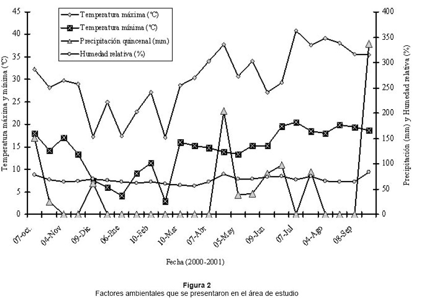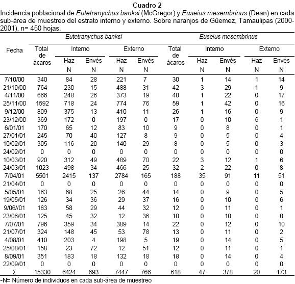 El presente trabajo se realizó en el Campo Experimental "General Francisco Villa" localizado en el municipio de Güemez, Tamaulipas en un huerto de 45 ha, con naranjos de la variedad Valencia de 25 años de edad. En el huerto los árboles tienen una altura promedio de 4 m; En el terreno se aplica riego por goteo con intervalos de 15 días, además de fertilización de tipo química y orgánica a inicio de floración. Se seleccionó un área de 1 ha con 150 árboles y de ellos se escogieron 15 árboles al azar. El área de estudio se mantuvo libre de agroquímicos en el ciclo del cultivo anterior y durante el presente estudio. A la copa de cada árbol se le dividió en dos zonas, una exterior de 50 cm de espesor y una que comprendió la parte interna del árbol. En cada área de muestreo, se seleccionaron 15 hojas al azar y a cada hoja se le subdividió en 2 sub-áreas, una que comprendió el haz de la hoja y la otra el envés. Las hojas se cortaron y se colocaron individualmente en bolsas de papel dentro de una hielera para inhibir el movimiento de los ácaros. El material se trasladó al laboratorio para realizar el conteo de los ácaros en cada una de las hojas colectadas. Se registró el número de ácaros presentes utilizando para ello un microscopio estereoscópico. Se realizaron 24 muestreos quincenales del 7 de octubre de 2000 a septiembre de 2001.