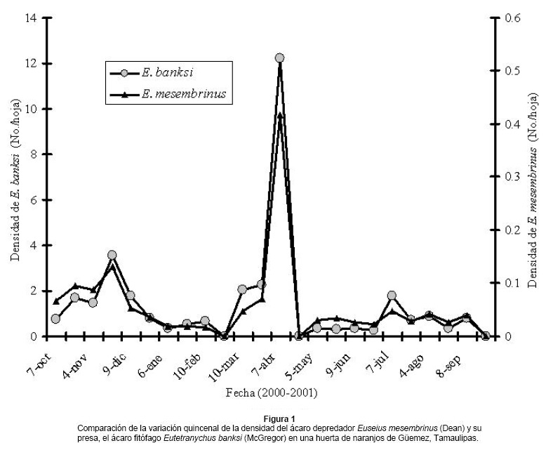 En la figura 1 se presenta el patrón de variación quincenal de la abundancia de E. banksi y E. mesembrinus en el periodo de estudio. En ambas especies se presentaron dos picos poblacionales muy evidentes: el primero el 25 de noviembre (E. banksi 3.53 ind./hoja; E. mesembrinus: 0.131 ind./hoja); y el segundo el 7 de abril (12.22 y 0.42 ind./hoja, respectivamente). Además, en ambas poblaciones se presentaron muestreos con cero ácaros en tres fechas de muestreo.