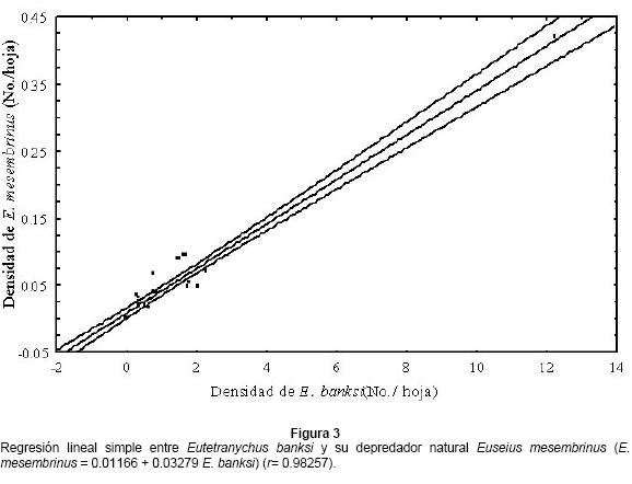 Se presentó una relación significativa entre los factores humedad relativa y precipitación. Sobre lo anterior Jeppson (1977) reporta que el desarrollo de Eutetranychus banksi se ve favorecido por la humedad relativa baja (10-30 por ciento) y temperaturas cercanas a los 32° C. Al respecto, French (1994) menciona que en Texas se favorece el desarrollo de esta especie a temperaturas de 27°C con periodos de ocho a diez horas por día, mientras que la presencia de lluvias intensas ejercen un efecto adverso sobre las poblaciones del ácaro. Browning (1983) reporta que las condiciones de clima caluroso y seco es más propicio para el desarrollo de Eutetranychus banksi.