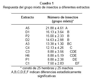 En lo que se refiere al sexo de los grupos de insectos probados el análisis general de las medias por el método de Tukey (w= 0.652 a una p< 0.05) permitió establecer una diferencia estadísticamente significativa cuando los extractos se probaron con el grupo mixtos de insectos (25 hembras + 25 machos), no encontrándose diferencias significativas entre los grupos de hembras, machos y de insectos tomados al azar. En el cuadro 1 se ilustra el efecto de la interacción extracto x sexo mixto para 10 fracciones diferentes. De acuerdo con la prueba de Tukey (w= 4.59 a una p < 0.05) la fracción A5 mostró una mayor actividad atrayente frente al grupo de insectos mixtos, no habiéndose encontrado diferencias entre D1,P2,D2,H3 y C4.