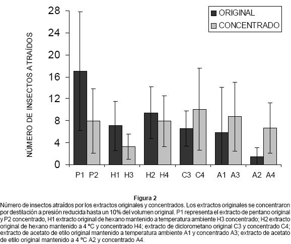 Como se describió en la metodología, todos los extractos se concentraron al 90% de su volumen original, por destilación a presión reducida. Este tratamiento produjo cambios importantes en su actividad atrayente como se muestra en la figura 2. Los extractos concentrados de pentano (P2) y hexano (H3) redujeron significativamente su actividad atrayente, mientras que los extractos concentrados de hexano (H4) y diclorometano (C4) no mostraron diferencias significativas con respecto a los extractos sin concentrar. En cambio, los extractos concentrados de acetato de etilo (A3 y A4) atrajeron mayor número de insectos que los extractos respectivos sin concentrar.