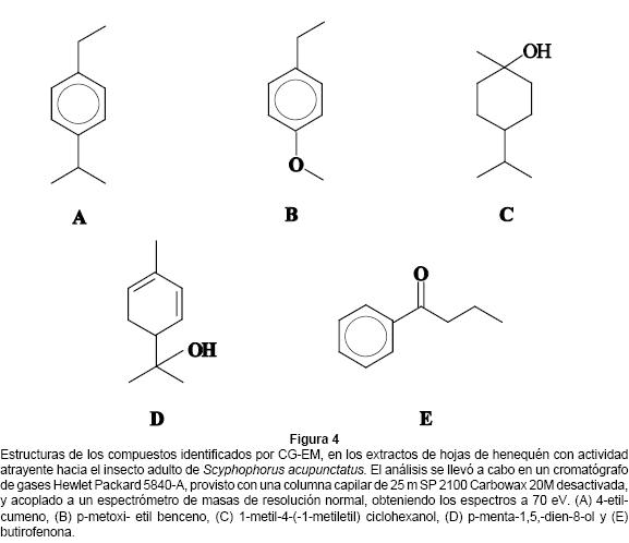 Los extractos de hoja de henequén con mayor actividad atrayente se caracterizaron por presentar 5 compuestos en común, los cuales de acuerdo a sus espectros de fragmentación corresponden a: 4 etil cumeno, p-metoxi-etil-benceno, 1-metil-4-(-1-metiletil) ciclohexanol, p-menta 1,5-dien-8-ol, y butirofenona.