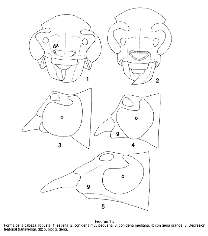 | 1 | Cabeza robusta (Fig. 1); gena muy pequeña a mediana (Figs. 3 y 4) ....................................................................................................10 | |