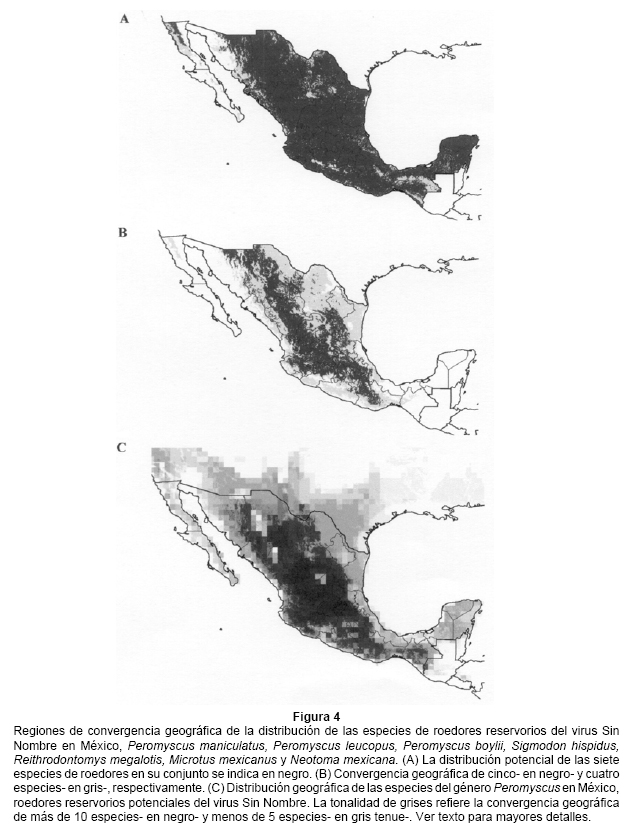 Las localidades con los casos reportados del síndrome pulmonar de hantavirus (SPH) en los Estados Unidos cubrieron una amplia región geográfica. Esta distribución coincidió significativamente mejor que al azar con la distribución potencial de Peromyscus maniculatus, P. leucopus y Sigmodon hispidus (Fig. 2), roedores que han sido identificados como los principales reservorios del virus Sin Nombre. Esta correlación geográfica permite partir del paradigma de que el modelado del nicho ecológico de especies que fungen como reservorios y vectores puede ser útil en predecir regiones de riesgo de enfermedades emergentes (Peterson et al. 2002) Este estudio plantea que este enfoque puede aplicarse al SPH, y que es posible identificar zonas de alto riesgo en función de modelado de los nichos ecológicos de los roedores reservorios.
