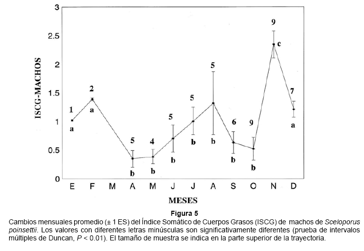 Al igual que S. poinsettii en este estudio, en la reproducción otoñal de otras lagartijas sceloporinas las hembras entran al invierno con al menos el 50% del máximo tamaño de los cuerpos grasos (Ortega 1985, Guillette & Bearce 1986). En las hembras, de S. poinsettii el ISCG presenta el valor más alto a finales del otoño en noviembre y decrece al principio del invierno en diciembre, cuando el índice somático ovárico es mayor, lo que sugiere que las hembras podrían estar utilizando los cuerpos grasos como fuente de energía para la vitelogénesis (Hahn & Tinkle 1965, Ramírez-Bautista et al. 2002). Después de este período se observan ISCG muy bajos, los cuales se mantienen con mínimas variaciones hasta el siguiente otoño. Este patrón de los cuerpos grasos es similar al encontrado en otras especies como S. jarrovii (Ramírez-Bautista et al. 2002), Uta stansburiana (Hahn & Tinkle 1965), S. mucronatus (Méndez-de la Cruz et al. 1988) y S. torquatus (Feria-Ortiz, et al. 2001).