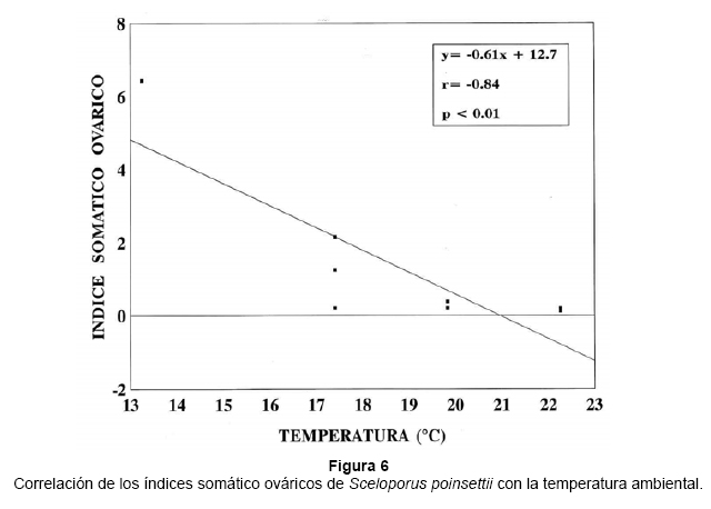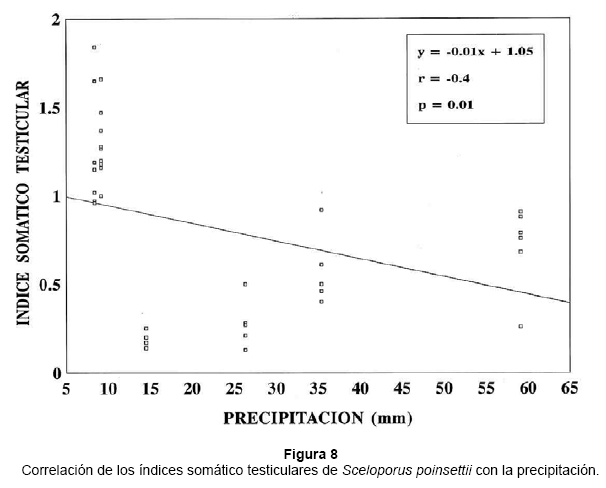 La actividad reproductora esta controlada por factores ambientales de los cuales los más importantes son el fotoperiodo, la temperatura del ambiente, y la precipitación (Marion 1982, Licht 1984). En la población de S. poinsettii de este estudio, la temperatura parece estar jugando un papel más directo con la reactivación gonadal que la precipitación, debido a que el incremento del índice gonado somático de ambos sexos, presenta una correlación negativa altamente significativa con la temperatura ambiental. De modo similar, Guillette y Méndez-de la Cruz (1993) encontraron que S. torquatus también presentó una correlación negativa alta de la reactivación testicular y la vitelogénesis con la temperatura del ambiente. Sin embargo, Ramírez-Bautista et al. (2002) encontraron en S. jarrovii que la actividad ovárica de las hembras se incrementó con el incremento de la temperatura y la precipitación. Estos autores sugieren que no todas las especies que habitan en zonas templadas responden en la misma dirección a las mismas señales ambientales.