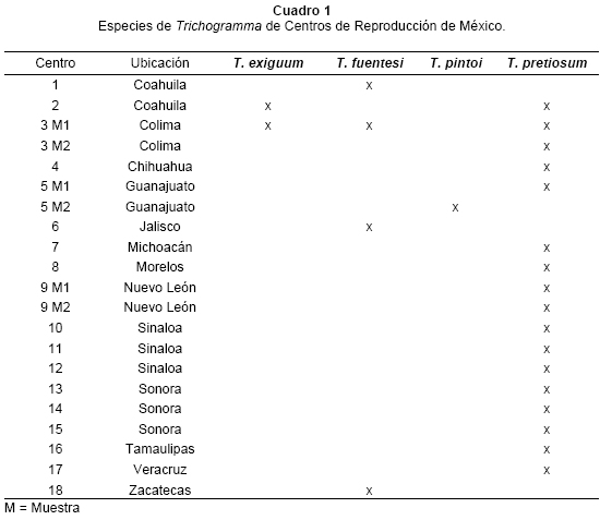 El presente estudio tuvo como objetivo, determinar las especies de Trichogramma de 21 muestras de centros reproductores y/o comercializadores de México.