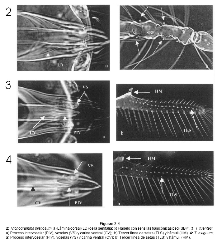 Trichogramma pretiosum. Genitalia con lámina dorsal (LD) con hombros angostos y usualmente no llegando a los márgenes laterales de la cápsula genital (Fig. 2a). Flagelo de las antenas con un par de sensilas basicónica peg (SBP) en las posiciones 2 y 3 (Fig. 2b).