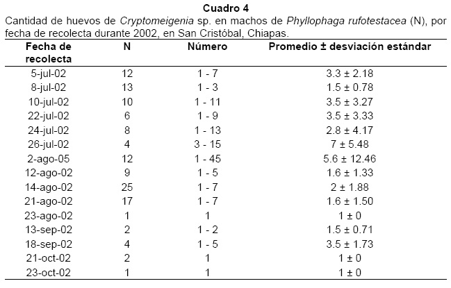 En 2002 se recolectaron 1385 individuos de P. rufotestacea, 564 fueron hembras y 821 machos, sacrificando todos en etanol. En su posterior revisión se encontró el 26.9 % de machos parasitados, sin conocer la identidad del parasitoide; en las hembras, no se pudo diferenciar entre los huevecillos del escarabajo y los del parasitoide. Por tal razón se realizó la recolecta en 2003, capturando un total de 1130 adultos, 1023 de los cuales se diferenciaron por sexos, encontrando el mayor porcentaje de parasitismo en los machos (Cuadro 1). Por fechas de recolecta de escarabajos, el porcentaje de parasitismo por Cryptomeigenia sp. fluctuó entre cero y 38.7%; estando presente en todo el período de emergencia del escarabajo (9-junio a 8-septiembre de 2003) (Cuadro 2). La actividad del parasitoide es nocturna como la de su hospedante. Esto coincide con la especie C. theutis Walker, referida para Norte América; sin embargo difiere en que esta última oviposita externamente sobre el cuerpo del escarabajo y sólo la pupación ocurre dentro del hospedante (Hanson 1996).