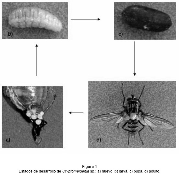 Cryptomeigenia sp. pasa por cuatro etapas de desarrollo (Fig. 1). 1) Huevo; es redondo, blanco cremoso, mide 0.93 mm; tarda de 4-5 días para eclosionar después de recolectado el escarabajo. 2) Larva; blanco-cremosa, mide 6.25-7.91 mm de longitud por 2.49-3.16 mm de ancho; se desarrolla en tres días. 3) Pupa; café rojiza, mide de 6.25-6.59 mm de longitud por 2.75-3.33 mm de ancho; tiene una duración de 19-23 días. 4) Adulto; mide de 5 a 8 mm de longitud y 14-17 mm de envergadura alar (Cuadro 3), el abdomen posee tres franjas transversales negras; permanece vivo durante seis días después de emerger del suelo, sin consumir alimento, al emerger deja un orificio circular en la parte terminal del abdomen del escarabajo. Las fases de huevo, larva y pupa se desarrollan dentro del escarabajo, con una duración de 29-32 días bajo condiciones de laboratorio.