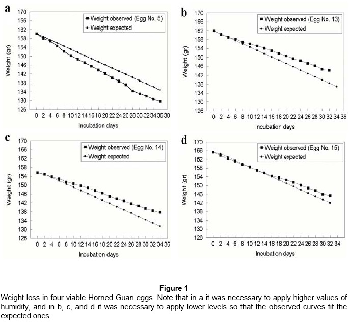Horned Guan eggs should lose at least 15% of their weight and/or initial density for successful hatching. The observed and expected curves do not necessarily have to coincide, but should stay within certain limits (13-17%), especially during first one-third of the incubation. A tolerance of around ± 2-3% of weight and/or density loss toward the end of the incubation process is acceptable for a successful hatching. An a posteriori analysis of the percentage of egg weight loss using the allometric equation of Rahn & Ar (1974), (considering the mean weight of the same) indicated Horned Guan eggs should lose 14.68% of their initial weight at the end of the incubation process.