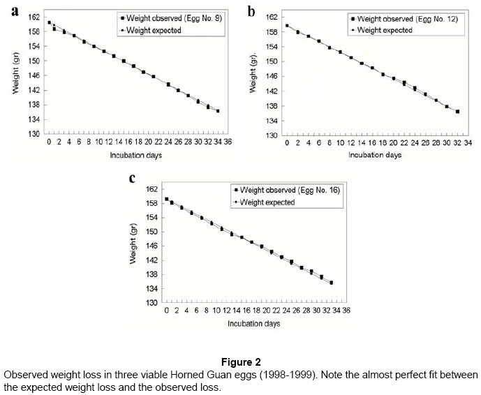 Horned Guan eggs had differences in weight and density, due to different incubation patterns. Weight loss followed a sigmoidal curve, similar to other birds species (Anderson & Robbins 1979). Similar patterns of weight loss rates have been reported in other birds species, where higher loss is experienced at the beginning and toward the end of the incubation period (Anderson & Robbins 1979, Olsen & Clubb 1997).
