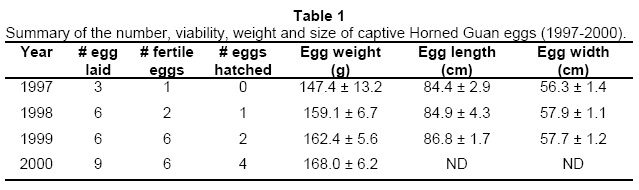 The Horned Guan is a member of the Cracidae family and it is limited to few isolated mountains ranges in Mexico and Guatemala. Horned Guan clutches consisted of two eggs, with a two day interval between eggs laid. In a four year period (1997-2000), five captive females laid a total of 30 eggs, four in 1997, six in both 1998 and 1999, and 14 in 2000. Eggs were laid during the months of March, April, May and June. Three of the eggs were laid from the perch and broken, and were not included in analyses.