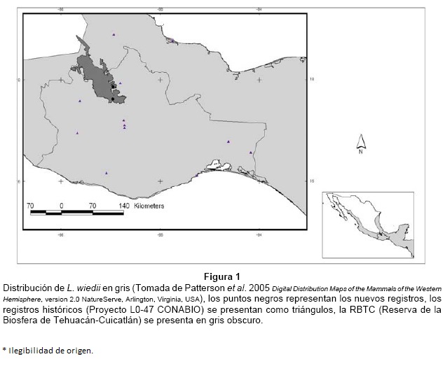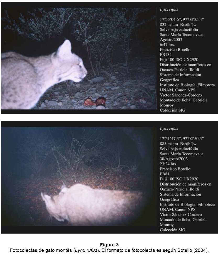 En agosto de 2003, tras un esfuerzo de captura de 260 noches-trampa, se registró el gato montés (Lynx rufus) en el municipio de Santa María Tecomavaca, en dos estaciones de muestreo ubicadas en una selva baja caducifolia a 835 msnm (17°51'47.3" N y 97°02'50.3" W y 17°55'04.6" N y 97°03'35.4" W, respectivamente). Estos son los primeros registros de esta especie dentro de la Reserva de la Biósfera de Tehuacán-Cuicatlán. En el primer sitio se tomaron dos fotografías consecutivas, a las 23:23 y 23:24 hrs, respectivamente; en el segundo sitio, se tomó una fotografía a las 6:47 hrs (Fig. 3). La distancia entre ambos sitios es de 6.3 km en línea recta.