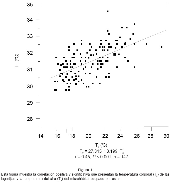 La Tc de estas lagartijas promedió 31.43 ± 0.1°C (intervalo 28.6-33.2°C). La Ta y Ts en la zona de estudio promediaron 20.02 ± 0.24°C (intervalo 14.6-24.8°C) y 20.67 ± 0.25°C (intervalo 15.6-28.2°C) respectivamente.