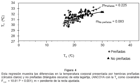 La Tc presentó una relación positiva y significativa con la Ta (Fig. 1, r = 0.451, P < 0.001; Tc= 27.529 + 0.195 Ta) y con la Ts (Fig. 2, r = 0.482, P < 0.001; Tc = 27.315 + 0.199 Ts) del microhábitat ocupado por cada lagartija. Por otro lado, la temperatura corporal para machos y hembras promedió 31.93 ± 0.17°C (rango 28.8 - 34.6), n = 55 y 31.26 ± 0.12°C (rango 28.6 - 33.4), n = 92, respectivamente, observándose una diferencia significativa en la temperatura corporal presentada por ambos sexos (Fig. 3, ANCOVA con la Ts como covariable F1,146 = 8.71, P = 0.003), siendo los machos los que dependieron en mayor medida de la temperatura del microhábitat (r = 0.53, P < 0.001; Tc = 25.185 + 0.31 Ts) con respecto a las hembras (r = 0.48, P < 0.001; Tc = 27.690 + 0.17 Ts). Por otra parte, la temperatura promedio para hembras preñadas y no preñadas fue de 30.42 ± 0.17°C (intervalo 28.6 - 32.6), n = 35 y 31.68 ± 0.14°C (intervalo 28.2 - 33.4), n = 57, respectivamente, encontrándose una diferencia estadísticamente significativa entre las hembras con ambas condiciones reproductivas (Fig. 4, ANCOVA con la Ts como covariable F1,91 = 18.81, P < 0.001). Asimismo se observó que las hembras preñadas dependieron en mayor grado de la temperatura del microclima (n = 57, r = 0.56, P < 0.001; Tc = 26.656 + 0.225 Ts) que las hembras no preñadas (n = 35, r = 0.3, P = 0.08; Tc = 27.845 + 0.083 Ts).