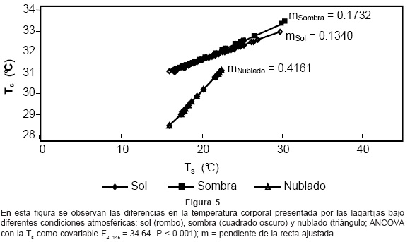 La temperatura de las lagartijas que ocupaban diferente condición (sol, sombra y nublado), promedió 31.7 ± 0.09°C (intervalo 29.2 - 33.8), n = 84; 31.8 ± 0.26°C (intervalo 29.2 -34.6), n = 37 y 29.6 ± 0.27°C (27.8 - 31.8), n = 26, respectivamente; observándose una diferencia significativa entre lagartijas que ocupaban sol y sombra con respecto a las que se encontraron en días nublados (ANCOVA con la Ts como covariable F2,145 = 34.64, P < 0.001, ver Fig. 5). Durante los días nublados la dependencia de los lacertilios hacia la temperatura del microhábitat fue mayor (r = 0.69, P < 0.001; Tc = 21.7497 + 0.4161 Ts), en comparación a los días soleados (r = 0.4, P < 0.001; Tc = 28.9 + 0.1340 Ts) ó cuando se encontraban en la sombra (r = 0.47, P < 0.001; Tc = 28.1173 + 0.1732 Ts).