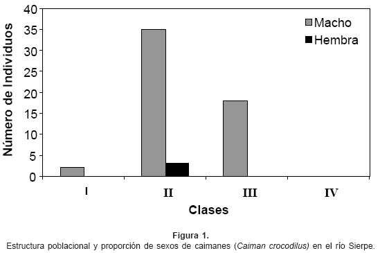 La proporción de sexos fue de 1:0.05 macho/hembra. En especies como Alligator mississippiensis, Melanosuchus niger, Paleosuchus palpebrosus, P. trigonatus y Crocodylus novaeguineae, se ha observado que la proporción de sexos difiere significativamente, siendo mayor la abundancia de machos (Thorbjarnarson 1997. Copeia 1997(2):451-455). La proporción de sexos dentro de la estructura poblacional puede ser atribuida a que las hembras tienden a desplazarse a sitios río arriba para llevar a cabo la anidación de la especie que inicia conjuntamente con la época lluviosa (Allsteadt 1994. J. Herpetol. 28(1):12-19). El bajo número de hembras reproductoras dentro de la población, podría estar relacionado con el número de individuos menores a 50 cm. Crawshaw (1990. In: J. G. Robinson and Kent H. Redford (eds.) Neotropical Wildlife Use and Conservation. University of Chicago Press) mencionó que la disminución en el número de hembras está asociado a la cacería, debido a que durante la época de anidación las hembras tienden a ubicarse en las orillas de los cuerpos de agua para proteger los nidos, siendo visibles para los cazadores, a diferencia de los machos que permanecen más tiempo en el agua. Por otro lado, se ha observado que el caimán presenta una distribución heterogénea dentro de su hábitat, sin embargo no se conoce si hay diferencias entre sexos por la selección del hábitat (Allsteadt & Vaughan 1992b. Brenesia 38:65-69, Thorbjarnarson 1997. Copeia 1997(2):451-455).