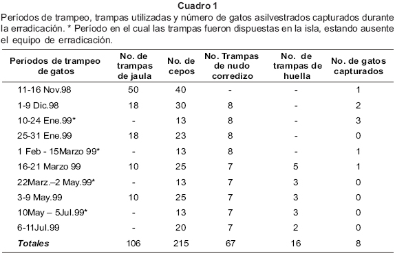 Trampeo de gatos: El trampeo y captura de gatos se llevó a cabo de noviembre de 1998 a marzo de 1999, habiendo capturado ocho individuos adultos, de los cuales siete fueron capturados con cepos y uno con trampa de jaula. En tres de los individuos capturados se encontraron en sus estómagos ratones de la especie Ch. spinatus pullus. De marzo a julio de 1999, se continuó el trampeo usando también trampas para huellas y cámara con sensor de movimiento. No se capturó ningún individuo ni se encontraron indicios de su presencia durante este período (Cuadro 1). En dos playas de la isla, durante mayo y julio de 1999, se vigilaron los restos de pescado destazados por los pescadores y dejados en las playas con la finalidad de detectar las huellas de los gatos, ya que en el pasado éstos se acercaban a los campamentos pesqueros para alimentarse de dichos restos, sin embargo ningún gato se acercó a ellos.