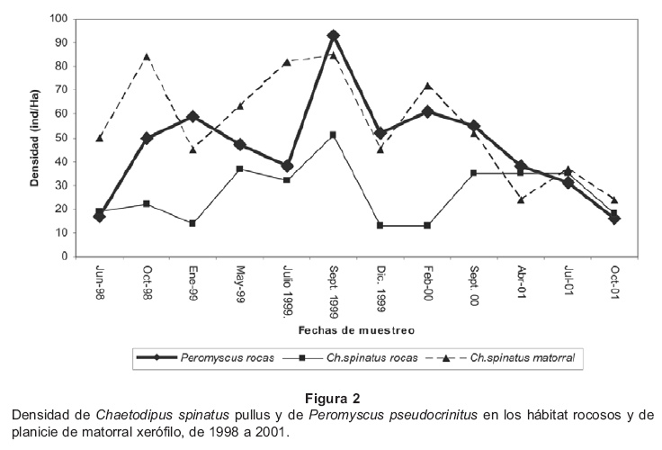 Mientras que para P. pseudocrinitus la densidad inicial en junio de 1998 (en el hábitat de rocas: 19 ind/ha), incrementándose hasta alcanzar valores máximos durante septiembre de 1999 (P. pseudocrinitus en rocas: 51 ind/ha), para posteriormente presentar una abrupta disminución en su densidad durante diciembre 2000 y febrero 2001 (13 ind/ ha en cada mes), con un posterior incremento durante los meses de septiembre 2000, abril y julio 2001 (35 ind/ha), disminuyendo, al igual que las poblaciones de Ch. spinatus pullus, durante el mes de octubre 2001. Los valores de densidad se incrementaron posteriormente hasta septiembre 2002 P. pseudocrinitus (en rocas: 64 ind/ha) (Fig. 2). En general, Ch. spinatus pullus presentó mayores densidades que las de P. pseudocrinitus en el hábitat rocoso. En las planicies halófilas, la captura de roedores fue escasa e irregular, Ch. spinatus pullus presentó un valor de densidad máximo durante septiembre 1999 (6 ind/ha), mientras que P. pseudocrinitus su mayor valor de densidad fue en diciembre de ese mismo año (2 ind/ha).