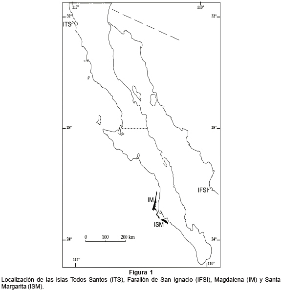Entre octubre del 2005 y febrero del 2006 se realizaron cuatro expediciones durante las que se visitaron islas del Océano Pacífico y del Golfo de California. Este esfuerzo es parte de un proyecto mayor, donde uno de los objetivos es confirmar la presencia actual de los vertebrados nativos insulares. Aquí proporcionamos los nuevos registros de reptiles de cuatro islas: Farallón de San Ignacio, Magdalena, Santa Margarita y Todos Santos Norte (Fig. 1). La estancia en cada isla fue de tres a seis días. Las zonas de muestreo incluyeron los principales microhábitat y se realizaron caminatas diurnas y nocturnas. Los especimenes recolectados fueron preservados por métodos convencionales (Casas et al. 1991. Cuadernos 10. IBUNAM) y depositados en la Colección Herpetológica de la Facultad de Ciencias de la Universidad Autónoma de Baja California (UABC), en Ensenada. A cada espécimen se le tomó una muestra de tejido que se preservó en etanol al 95% para futuros estudios moleculares.