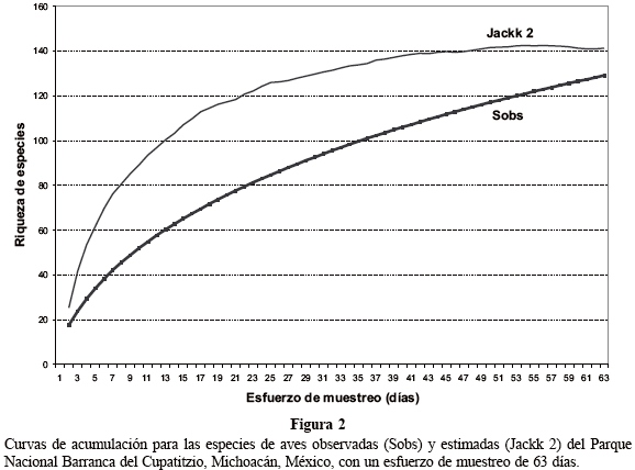 Curva de acumulación de especies. La curva de acumulación de especies (Sobs) mostró un incremento creciente que no se estabilizó al término del muestreo (Fig. 2). Con base en los criterios definidos por Chazdon et al. (1998) para evaluar el desempeño de los diversos estimadores de la riqueza de especies se determinó que el Jackknife de segundo orden (Jackk 2) fue el que mejor se desempeñó, por lo que se eligió para el presente análisis. La curva generada mostró un rápido incremento que se estabilizó después de 50 días de muestreo (Fig. 2) y sugiere que pueden registrarse 13 especies adicionales para un total de 141; la riqueza obtenida de especies registradas equivale al 90.8% de las especies potenciales en la zona de estudio.