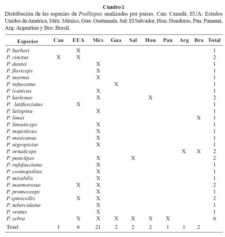 En el cuadro 1 se resume la distribución de Pselliopus en América. Las especies se distribuyen principalmente en México (21 de un total de 27). La especie P. cinctus se distribuye en Canadá y los Estados Unidos, países donde se distribuyen también P. barberi, P. latifasciatus, P. marmorosus, P. spinicollis y P. zebra. Para América Central se han registrado especies en Guatemala, El Salvador, Honduras y Panamá; en todos estos países se ha citado P. zebra, además para el primero P. infuscatus, para el segundo P. punctipes y para el tercero P. karlenae. En América del Sur se ha registrado a P. ornaticeps para la Argentina y Brasil; de este último país también se conoce a P. limai (Maldonado-Capriles 1990). Es posible que existan más especies en las montañas de América Central y del Sur, por lo que se requieren muestreos en estas zonas. Por otra parte, P. zebra es la especie de distribución más amplia, habiéndosela registrado en seis países; sin embargo, tiene problemas taxonómicos y no se ha establecido claramente si se trata de una especie variable o las variaciones corresponden a especies diferentes, ya que no se analizaron suficientes ejemplares.
