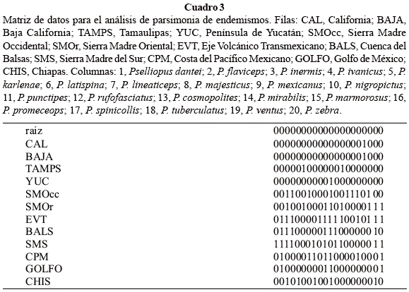 Los datos de distribución se obtuvieron de Brailovsky et al. (2007). Se analizaron 20 (de un total de 21) especies mexicanas de Pselliopus, ya que P. rayonensis Brailovsky et al., se conoce de una sola localidad y por ello fue excluida del análisis. Si bien algunos de los trazos individuales atraviesan el Altiplano Mexicano, en realidad los registros son periféricos a esta provincia biogeográfica, por lo que la misma no fue incluida en el análisis.