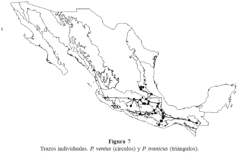 Del análisis de la matriz de datos (Cuadro 3), se obtuvieron cuatro cladogramas de 36 pasos, índice de consistencia de 0.55 e índice de retención de 0.62. A partir del único componente sustentado por dos especies (P. nigropictus y P. zebra) en su consenso estricto (Fig. 8), se obtuvo un trazo generalizado que comprende básicamente la Sierra Madre Oriental, la Costa del Pacífico Mexicano, el Golfo de México, la Cuenca del Balsas, el Eje Volcánico Transmexicano y la Sierra Madre del Sur. Luego de eliminar los trazos individuales que lo sustentan, el análisis dio 12 cladogramas de 31 pasos, índice de consistencia de 0.58 e índice de retención de 0.62; en seis de estos cladogramas, se halló un trazo generalizado que comprende las mismas áreas que el anterior, además de Chiapas y la Sierra Madre Occidental. Consideramos la sumatoria de ambos como un trazo generalizado (Fig. 9).