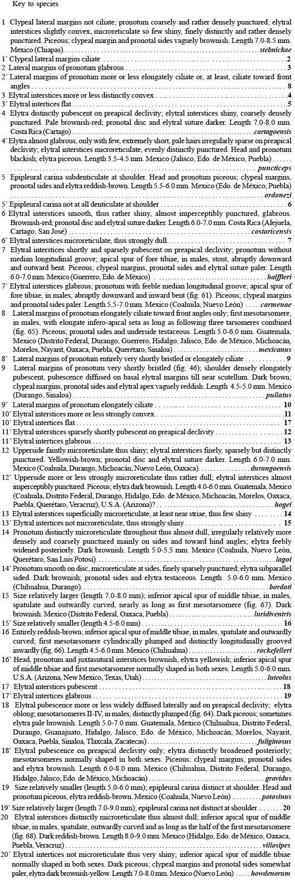 Material examined: MEXICO -Durango: Buenos Aires, 7 mi. SW, 8800 ft., 20.VII.1982, leg. Andrews F. G. (cowdung), 3 exx. (CSCAG); Coyotes, 8300 ft., Durango Dist., 8.VIII.1947, leg. Cazier, D. Rockefeller Exp., 1 ex. (AMNHNY); Durango, 6200 ft., 14.VIII.1947, leg. Gertsch, D. Rockefeller Exp., 1 ex. (AMNHNY); Durango, 26.5 mi. SW, 21.VII.1982, leg. Andrews F. G. (blacklight), 3 exx. (CSCAG); El Salto, 12.VII.1990, leg. J. Stamatov, 2 exx. (AMNHNY); El Salto, 6 mi. N.E., 8500 ft., Durango Dist., 10.VIII.1947, leg. Cazier, D. Rockefeller Exp., 5 exx. (AMNHNY); idem, 10.VIII.1947, leg. Schramel, D. Rockefeller Exp., 1 ex. (AMNHNY); El Salto 28 mi. E, 8000 ft., 22.VII.1964, leg. Chemsak J. A. & Powell J. (black & white lights), 1 ex. (EMEB); km 125 carr. El Salto-Mazatlán, El Salto dint. W, m 2400, 23°45’20.6"N-105°31’17.0"W, 20.VII.2004, leg. Dellacasa M. & Martínez I. (horse dung), 18 exx. (DCG); Nueva Patria [Santo Domingo], carr.-S. Miguel de Cruces, m 1950, 24°05’07.5"N-105°27’16.7"W, 19.VII.2004, leg. Dellacasa M. & Martínez I. (bosque pino-encino, horse dung), 159 exx. (DCG); Otinapa dint., m 1200, 24°03’26.5"N-105°00’29.6"W, 19.VII.2004, leg. Dellacasa M. & Martínez I., 61 exx. (DCG); Rancho la Peña, 20.VI.1979, leg. Zunino M., 3 exx. (DCG); Res. Biosf. La Michilía, El Alemán, m 2250, 23°20’15"N-104°10’13"W, 30.VI.2004, leg. Huerta C. & Anduaga S., 1 ex. (DCG); Guerrero: carr. Tlatlauquitepec-Zapotitlán Tablas, Crucero el 12, m 2200, 17°28’56.2"N-98°50’16.7"W, 23.VII.2003, leg. Dellacasa M. & Martínez I., 127 exx. (MSNTC, DCG); carr.-Olinalá, 1.5 km desp. Tres Caminos, m 1750, 17°35’37"N-98°44’19"W, 22.VII.2003, leg. Dellacasa M. & Martínez I., 123 exx. (MSNTC, DCG); Hidalgo: Mineral del Chico, 20°13’00.3"N-98°43’51.1"W, m 2358, 4.VII.2005, leg. Dellacasa M. & Martínez I., 4 exx. (MSNTC); Tejocotal dint., 20°08’07.5"N-98°09’08.6"W, m 2136, 5.VII.2005, leg. Dellacasa M. & Martínez I., 228 exx. (MSNTC); Zacualtipán, leg. Hoge, 1 ex. (DCG); Jalisco: Concepción B. Aires, Paso Hondo, 12.VI.2003, leg. Curoe D. & Nogueira, 1 ex. (USNMW); carr.-Copála, Copála dint., m 1800, 19°60’N-103°76’W, 28.VII.2003, leg. Dellacasa M. & Martínez I., 7 exx. (MSNTC, DCG); Puerto Los Mazos, 8 Km SE, Camino de Microondas, 19.VII.1994, leg. McCarty J. D., 1 ex. (EMEB); México: Aculco env., 20°02’08.6"N-99°51’05.3"W, m 2615, 7.VII.2006, leg. Dellacasa M., Fresi C. & Martínez I., 68 exx. (DCG, MSNTC); carr.-Valle de Bravo, Rancheria San Antonio, m 2250, 19°19’N-100°05’W, 27.VII.2001, leg. Dellacasa M. & Martínez I., 66 exx. (MSNTC, DCG); Chalma, m 1550, 5.VII.1980, leg. Zunino M., 3 exx. (DCG); rd. Mex-15 Zitácuaro-Toluca, El Jacal, m 2300, 19°24’13.1N-100°05’53.9W, 27.VII.2001, leg. Dellacasa M., 7 exx. (MSNTC); Real de Arriba, Temescaltepec, VII.1932, leg. Hinton H. E. & Usinger R. L., 1 ex. (DCG); idem, VII.1933, leg. Hinton H. E. & Usinger R. L., 1 ex. (USNMW); Tejupilco, Temescaltepec, VII.1932, 1 ex. (USNMW); Michoacán: Cruz Gorda dint., 19°22’44.6"N-101°29’47.3"W, m 2706, 30.VI.2005, leg. Dellacasa M. & Martínez I., 162 exx. (DCG, MSNTC); idem, m 2250, 19°21’58.5"N-101°29’33.1"W, 25.VII.2003, leg. Dellacasa M. & Martínez I., 3 exx. (DCG); Los Azufres, 19°49’54.8"N-100°39’40.7"W, m 2916, 2.VII.2005, leg. Dellacasa M. & Martínez I., 40 exx. (MSNTC); idem, m 2550, 19°49’57.2"N-100°39’42.2"W, 22.VII.2004, leg. Dellacasa M. & Martínez I., 7 exx. (DCG); Patambán dint., m 1800, 19°38’19.8"N-102°16’29.2"W, 26.VII.2003, leg. Dellacasa M. & Martínez I., 2 exx. (MSNTC); rd. Mex-15 Morelia-Cd. Hidalgo, Mil Cumbres, m 2000, 19°39’N-100°59’W, 26.VII.2001, leg. Dellacasa M. & Martínez I., 1 ex. (MSNTC); rd. Mex-41 Pátzcuaro-Tacámbaro, La Estacada, m 2450, 19°24’N-101°22’W, 25.VII.2001, leg. Dellacasa M. & Martínez I., 7 exx. (DCG, MSNTC); rd. Mex-41 Pátzcuaro-Tacámbaro, Santa Clara del Cobre dint., m 2200, 19°24’N-101°35’W, 25.VII.2001, leg. Dellacasa M. & Martínez I., 1 ex. (MSNTC); Tacámbaro, 25.VII.2001, leg. Dellacasa M. & Martínez I., 4 exx. (DCG); Uruapan, 28.11.1980, leg. Zunino M., 1 ex. (DCG); Nayarit: Ahuacatlán 6 mi. W, 19.VII.1954, leg. Schlinger E. I., 1 exx. (EMEB); Mirador Barranca del Oro, m 1650, 20°59’35.0"N-104°27’56.9"W, 1.VIII.2003, leg. Dellacasa M. & Martínez I., 8 exx. (MSNTC, DCG); Oaxaca: carr. Mex-135 ante Sola de Vega, 1900 m, 16°27’50.0"N-96°59’27.9"W, 5.VII.2002, leg. Dellacasa M. & Martínez I., 65 exx. (MSNTC); carr. Mex-135, Cieneguilla dint., 2000 m, 17°28’08.4"N-96°56’18.7"W, 9.VII.2002, leg. Dellacasa M. & Martínez I., 2 exx. (MSNTC); El Cerezal, 36 Km NE Oaxaca, m 2300, 12.VI.1979, leg. Howden H. & A., 1 ex. (HAHCO); Ixtlan, 14 mi. S, 7500’, 27.VII.1971, leg. Newton A., 2 ex. (HAHCO); Mpio. San Mateo Río Hondo, El Manzanal, 2500 m, 16°07’57.4N-96°29’48.5"W, 6.VII.2002, leg. Dellacasa M. & Martínez I., 46 exx. (MSNTC); Oaxaca, 22 Km NE, m 2600, 12.VI.1979, leg. Howden H. & A., 1 ex. (HAHCO); rd. Mex-135, San Gabriel Mixtepec dint., 2600 m, 16°13’13.8"N-97°08’55.7"W, 9.VII.2002, leg. Dellacasa M. & Martínez I., 1 ex. (MSNTC); rd. Mex-175 Oaxaca-Tuxtepec, La Cumbre, 2500 m, 17°10’31.2"N-96°36’14.2"W, 10.VII.2002, leg. Dellacasa M. & Martínez I., 4 exx. (MSNTC); rd. Mex-175-Miahuatlán, San José Pacifico, 2250 m, 16°09’55.4N-96°30’07.1"W, 6.VII.2002, leg. Dellacasa M. & Martínez I., 18 exx. (MSNTC); rd. Mitla-S. Pablo Ayutla, Laguna San Pablo, 1800 m, 16°59’29.0"N-96°07’41.0W, 7.VII.2002, leg. Dellacasa M. & Martínez I., 10 exx. (MSNTC); San Pablo Ayutla dint., 1800 m, 17°01’06.1"N-96°05’54.8"W, 7.VII.2002, leg. Dellacasa M. & Martínez I., 36 exx. (MSNTC); Sola de Vega, 5 Km S, m 1600, 4-9.VII.2005, leg. Curoe D., 1 ex. (USNMW); Suchixtepec, 8 Km S, Río Molino, m 2200, 16.VI.1979, leg. Howden H. & A., 2 exx. (HAHCO); Puebla: Venta Grande, 20°07’29.0"N-98°06’07