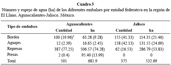 En el estado de Aguascalientes se contabilizaron 501 embalses, los cuales cubrieron de manera aproximada una superficie de 681.9 ha, siendo las represas los cuerpos de agua más abundantes con 387 y cobertura de 506.57 ha. En el estado de Jalisco fueron 375 y sumaron un área de 532.69 ha. Los aguajes y los bordos fueron los más numerosos (158 y 155, respectivamente) en esta entidad; sin embargo, las represas (N = 62), a pesar de ser menos abundantes que esos embalses, cubrieron mayor superficie de espejo de agua (286.79 ha), constituyendo el 53.83% aproximadamente de la superficie de los embalses de la entidad, de manera equivalente, aunque en menor proporción, a lo encontrado en el estado de Aguascalientes (Cuadro 3).
