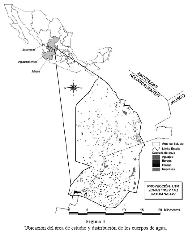 A una escala mayor se elaboró un inventario de todos los embalses de la región. Para ello se utilizó un Sistema de Información Geográfica construido en una plataforma en ARC VIEW 9.1 ®, mapas topográficos digitales F13B89, F13D19, F13D29, F14A81 y F14C11 escala 1:50,000, y una imagen satelital del sensor LANDSAT TM 29/45 del mes de agosto de 2002, proporcionados por el departamento de Geomática de la Procuraduría Estatal de Protección al Ambiente de Aguascalientes. Con estos materiales se digitalizaron y clasificaron todos los embalses y se estimó la superficie cubierta con agua de cada embalse. Esta información permitió un análisis de uso-disponibilidad a nivel regional, para determinar sí el patrón de selección de embalses encontrado a nivel de la muestra, se repite al extrapolar las densidades del pato mexicano sobre el universo de los embalses del área de estudio.