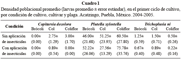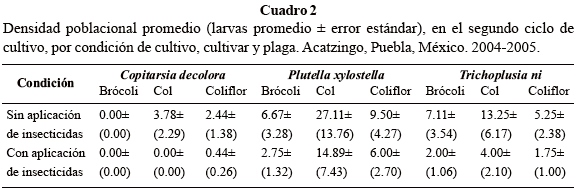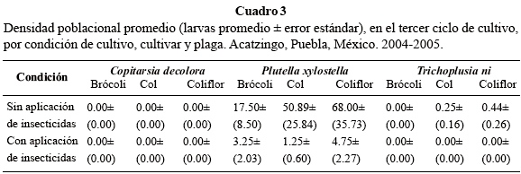Durante los tres ciclos de cultivo no se identificaron individuos de C. decolora en brócoli para ambas condiciones de muestreo, con y sin aplicación de insecticidas (Cuadros 1, 2 y 3). Esto confirma lo reportado por Suárez (2006), quien identificó a C. decolora como plaga de col y coliflor, pero no de brócoli, en Acatzingo, Puebla, México. Una explicación posible a este comportamiento de C. decolora, podría ser que el brócoli presente sustancias inhibitorias que reducen la tasa de crecimiento y reproducción, tal como lo mostraron Flores et al. (2004) con la cría de Copitarsia bajo diferentes dietas a base de crucíferas, entre ellos el brócoli. En col y coliflor se detectaron mayores cantidades de larvas, especialmente en la condición sin aplicación de insecticidas, durante los primeros dos ciclos de cultivo. En el tercer ciclo de cultivo (Cuadro 3), no se mostraron larvas de Copitarsia en ninguno de los cultivos, lo cual está relacionado con la época del año y las condiciones fenológicas de los cultivos.